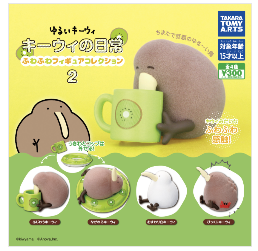 ラインナップは「おすわり白キーウィ」「ながれるキーウィ」「あじわうキーウィ」「びっくりキーウィ」の全4種。
